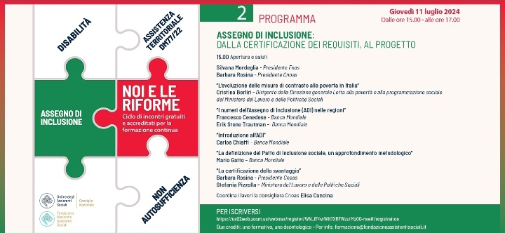 Ecco il secondo dei quattro webinar gratuiti e accreditati per la formazione degli assistenti sociali. Parliamo di: “Assegno di inclusione: dalla certificazione dei requisiti al progetto”, giovedì 11 luglio dalle ore 15.00 alle 17.00 e ci sono ancora posti disponibili.