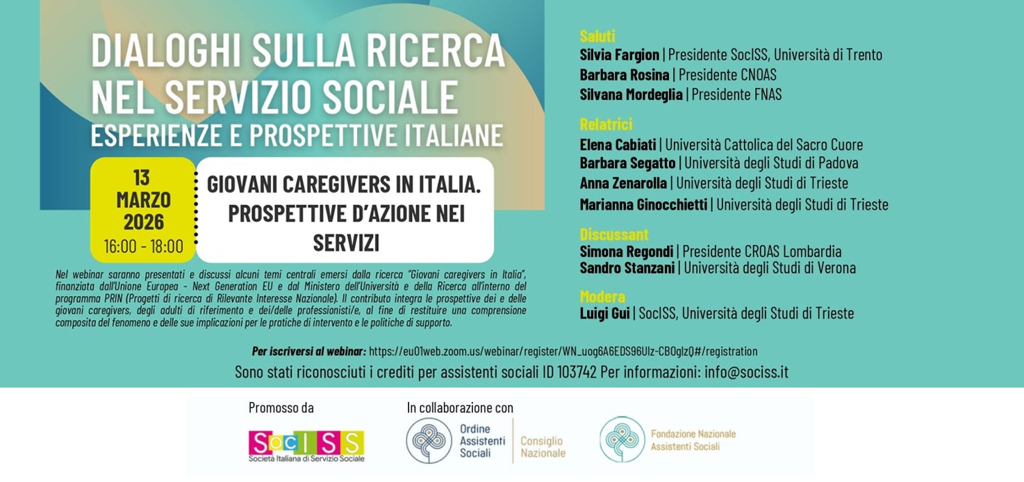 Per i “Dialoghi sulla ricerca di Servizio Sociale”, venerdì 13 marzo, dalle 16 alle 18, è in programma il webinar su “Giovani caregiver in Italia. Prospettive d’azione nei servizi”.