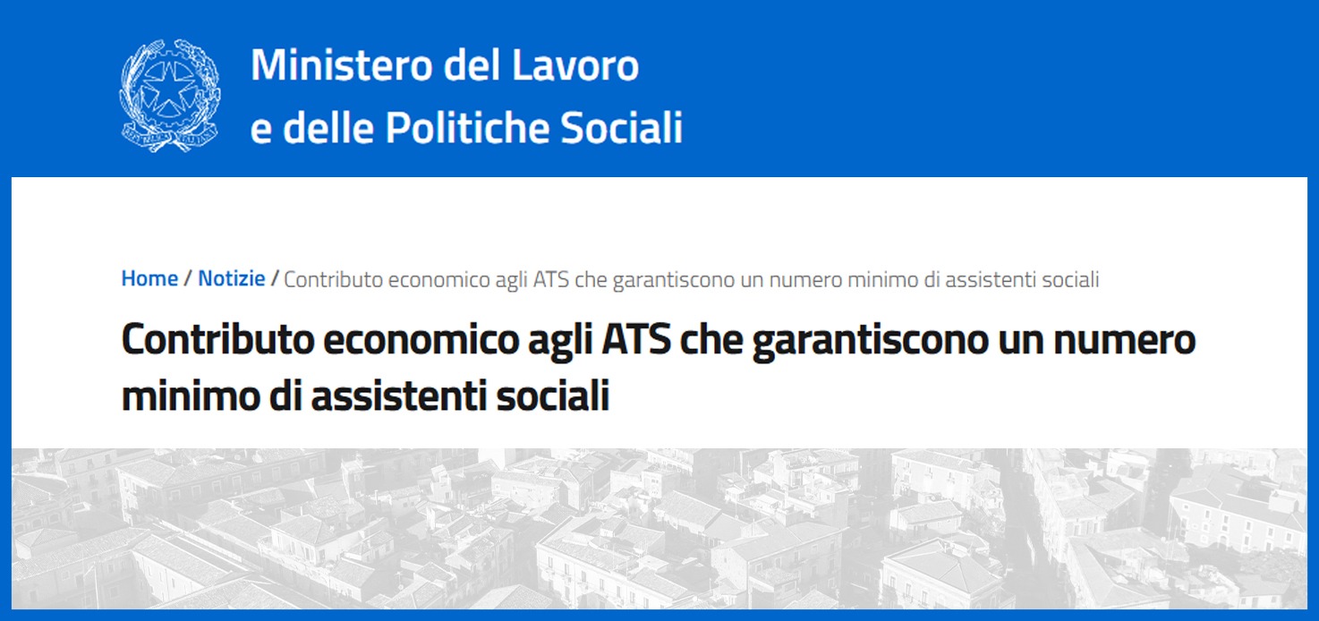 Il Ministero del Lavoro e delle Politiche Sociali ricorda che per potenziare il sistema dei servizi sociali comunali è prevista l’erogazione di un contributo economico a favore degli Ambiti sociali territoriali (ATS) in ragione del numero di assistenti sociali impiegati in proporzione alla popolazione residente.
