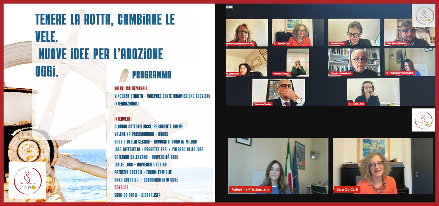 Con la consigliera nazionale Valentina Prisciandaro, abbiamo partecipato la scorsa settimana al convegno in streaming “Tenere la rotta, cambiare le vele. Nuove idee per l’adozione oggi”, organizzato dal coordinamento Care, ente del Terzo Settore che supporta e promuove l’associazionismo familiare adottivo o affidatario, sostiene queste famiglie e tutela i diritti delle bambine e dei bambini in stato di abbandono o provenienti da nuclei in difficoltà.