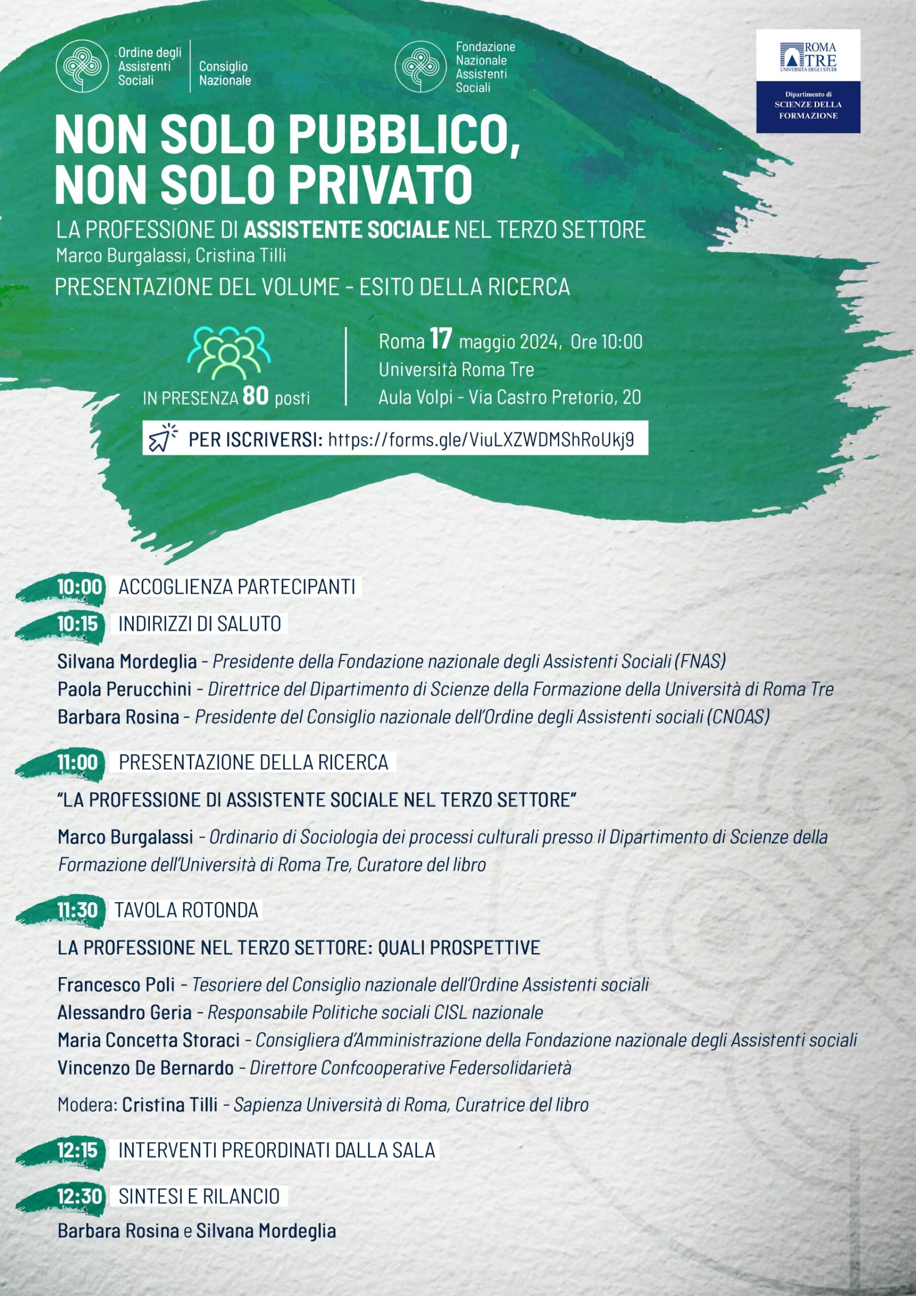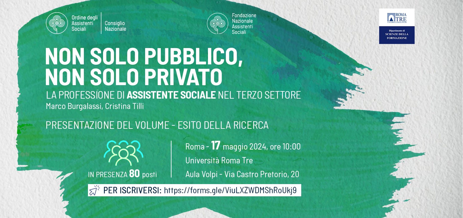 All’evento – è stato richiesto l’accreditamento per la formazione continua degli assistenti sociali – “Non solo pubblico, non solo privato. La professione di assistente sociale nel Terzo”, partecipano, oltre ai curatori del volume, le presidenti del Consiglio nazionale degli Assistenti Sociali e della Fondazione Nazionale degli Assistenti Sociali, Barbara Rosina e Silvana Mordeglia; la direttrice del Dipartimento di Scienze della Formazione dell’Università di Roma Tre, Paola Perucchini; Francesco Poli, consigliere e tesoriere Cnoas; Alessandro Geria, responsabile politiche sociali della Cisl; Maria Concetta Storaci del Cda Fnas e Vincenzo De Bernardo direttore Confcooperative Federsolidarietà.
